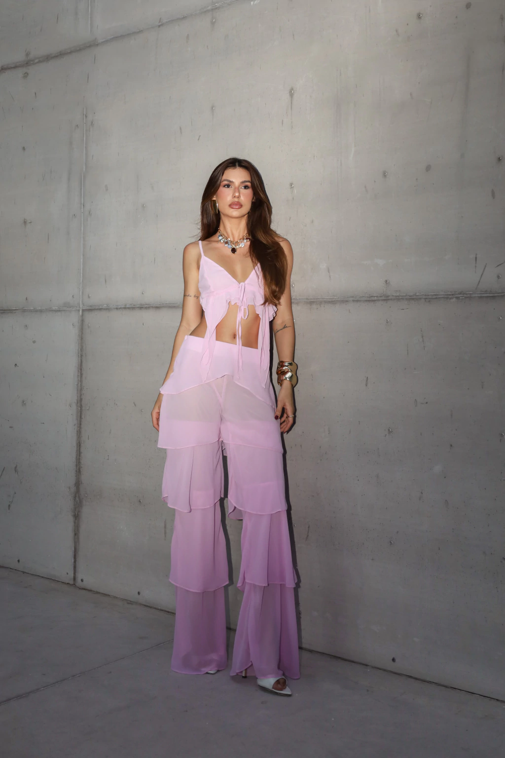 Calça de cintura media baixa com elastico interior. . Pernas retas. Fecho lateral com zíper e comprimento com camadas de babados.