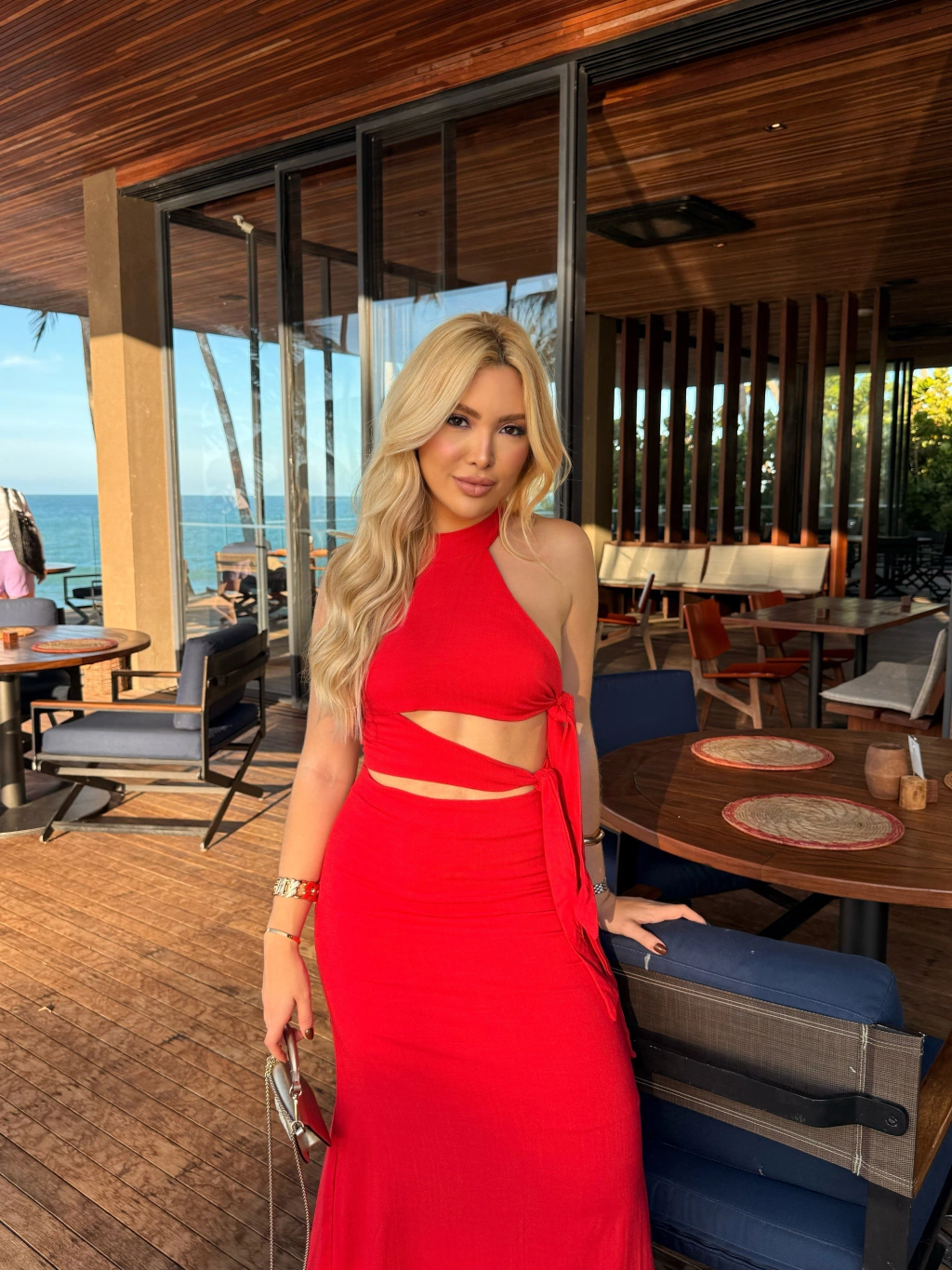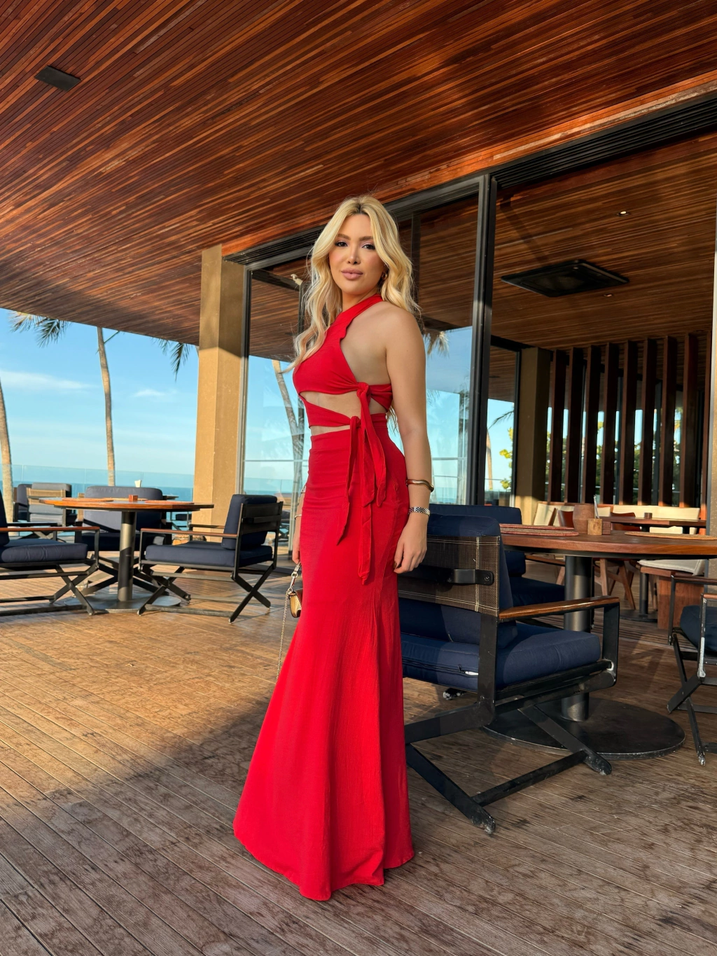 Modelagem: Vestido decote regulável, amarrações nas laterais, manga nula