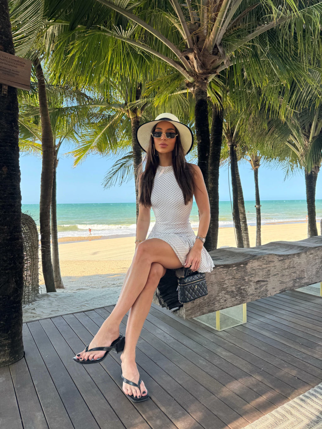 É um vestido curto com babado duplo, todo forrado em poliamida e gola alta.